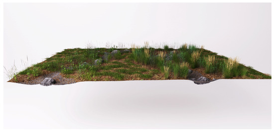 For the aims of the research, a test site was selected consisting of a green roof of a campus building. The size of the selected sedum green roof is 25 m × 25 m (625 m2), and it is surrounded by terrace areas and hard roof surfaces. The size of the area fits well with the aims of the research to study the solutions as nature-based landscape architecture solutions applicable to areas other than green roofs, such as courtyards of residential blocks. Additionally, the compact size of the demonstration site helped in the development of the workflow while using limited computational resources.