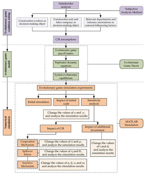 The theoretical framework of this study consists of three parts, as shown in Figure 1. The first part is to analyze the relationship between the relevant subjects of the evolutionary game utilizing the stakeholder theory. In view of this, the basic assumptions of the model and the CSI assumptions are proposed. Then the parameters are set and the parameters are used to analyze the evolutionary game payoff matrix and the replicator dynamic equation. The second part is to determine the range of values of the dependent variable and each parameter in conjunction with the characteristics of the values of the independent variables in the replicator’s dynamic equations. This makes a preliminary analysis of the evolutionary equilibrium state of the system and the influence of parameter changes. Finally, numerical simulations are performed using MATLAB in order to explore the effect of the initial ratio of transformation on the equilibrium point of the system. A sensitivity analysis, which is used to probe the impact of the CSI mechanisms on the system evolution, was also performed.