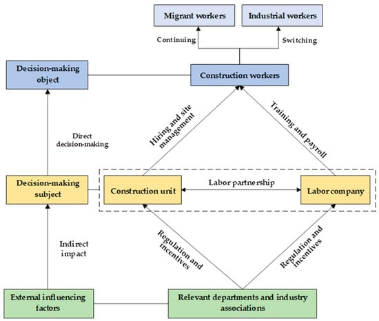 - Decision-making object: construction workers. There are generally two types of construction workers: migrant workers and industrial workers. Migrant workers in the construction industry are a group of people whose household accounts are in rural areas, while their main source of income is through performing construction labor, technical work, or construction management at construction sites []. Compared with traditional construction migrant workers, industrial workers are able to master modern professional skills. Their wages, working conditions, and safety can be effectively guaranteed. They generally represent the advanced productivity of the construction industry [].