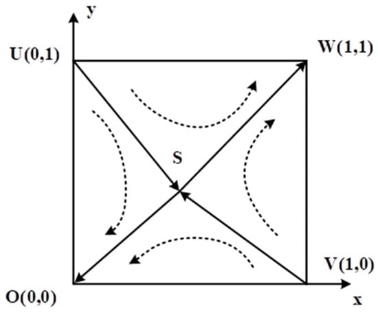 The group members involved in the game have myopic optimal response dynamics in nature. The initial state affects the behavioral patterns of the game participants in a customary manner and ultimately determines the direction in which the group equilibrium strategy moves []. The closer converges to the point O, the larger the area of the quadrilateral USVW is. It indicates that the possibility of the evolutionary game converging to the ideal state W (both sides of construction unit and labor company choose to switch to industrial workers) is greater.
