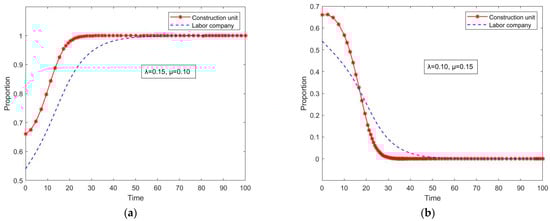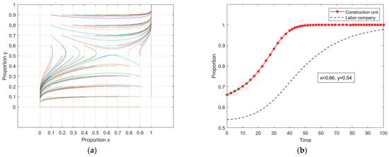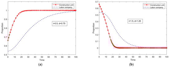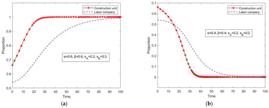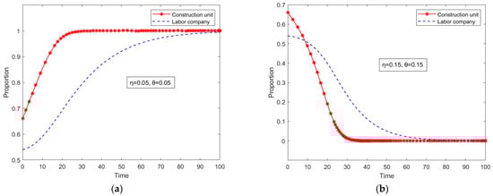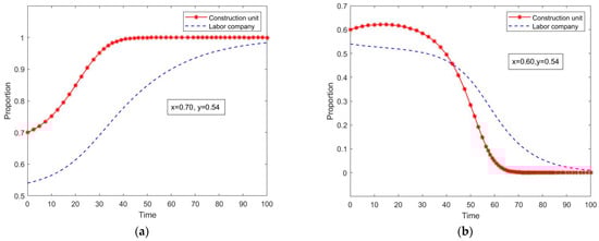 As shown in Figure 6a, when , both the construction unit and labor company converge to the desired state at a faster rate. At this point, the initial proportion of labor companies choosing to transform industrial workers is greater than 0.54. As shown in Figure 6b, when this initial proportion is less than 0.54, such as , the system converges to the undesirable state.