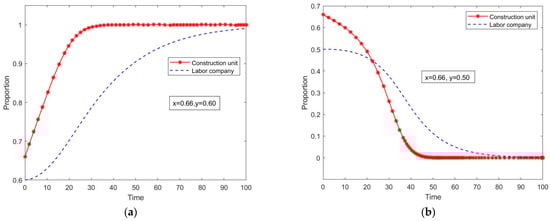 As shown in Figure 5a, when , both the construction unit and labor company converge to the desired state at a faster rate. At this point, the initial proportion of the construction unit choosing to switch to industrial workers is greater than 0.66. As shown in Figure 5b, when the initial proportion is less than 0.66, such as , the system converges to the undesirable state.