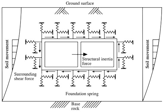 The response displacement method is a common method for seismic design of underground structures. It uses beam element modeling and soil springs to consider the dynamic response and interaction between underground structures and soil. The seismic load is applied to the structure in the form of relative displacement of the soil layer in the free field, the shear force of soil around the structure, and the peak acceleration of ground. Finally, the internal force and deformation of the structure under seismic load are obtained via calculation. The simplified mechanical model is shown in Figure 1.