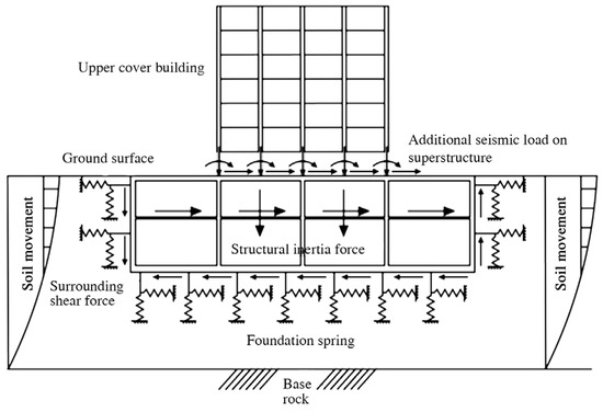 The response displacement method has a rigorous theory and high calculation accuracy. The upper structure has a great influence on the internal force and deformation of the subway station [6]. Applying the load-structure model of the traditional response displacement method to the seismic analysis of the subway station structure under the upper structure will lead to two problems. On the one hand, the unfavorable factors of the upper cover structure are not considered, resulting in a smaller calculation result. On the other hand, it cannot reflect the influence of changes in the internal force and deformation of the upper-cover structure of the subway station. Therefore, the calculation results of the traditional response displacement method do not meet the requirements for the integrated subway station and its upper cover structure.