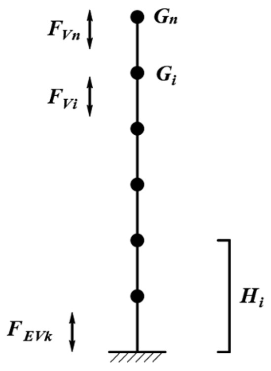 The equivalent base shear method can be used to calculate the vertical inertia force of the upper building. It is an equivalent horizontal seismic action method. The calculation diagram is shown in Figure 3. The calculation formula is: