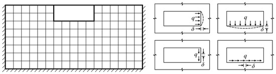 (2) Solve for the foundation spring stiffness. The convergent shear modulus of each soil layer calculated using the one-dimensional free field is used to establish a finite element model of the soil layer, as shown in Figure 4. The horizontal and vertical uniformly distributed loads are applied at the location of the model structure to obtain the deformation in both directions and to derive the coefficient of foundation, which can also be derived from the inverse by applying forced displacements. Finally, the foundation spring stiffness is obtained by the formula k = Kld, where k is the foundation spring stiffness; K is the bed coefficient; l is the concentrated spring spacing of the foundation; d is the calculated length of the stratum along the longitudinal direction of the underground structure.
