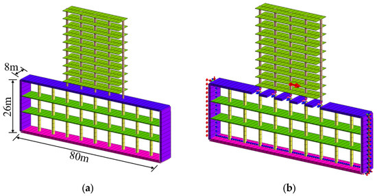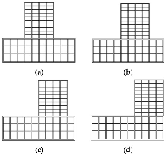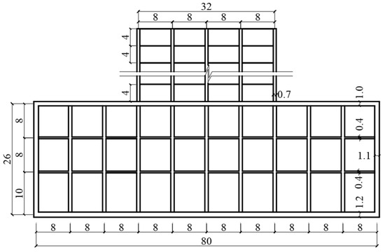 The plan layout of the three upper cover structures forms is shown in Figure 13, where the frame column cross-section size of the frame-shear wall is 0.7 m × 0.7 m, the thickness of the shear wall is 0.5 m, and the beam has a cross-section size of 0.4 m × 0.8 m.