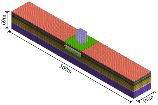 Based on the project, the improved response displacement method model for seismic calculation of underground structures is shown in Figure 6. The load-structure model is modeled by the equivalent frame method [16], that is, the middle column of the subway station is taken as the prototype size of 0.8 m × 1.2 m, the lateral width of the side wall and the top and bottom plates is taken as the actual width, and the longitudinal length is taken as the sum of the half column spacing before and after the middle column, that is 8.0 m. At the same time, the calculation accuracy of the improved response displacement method was evaluated, and the calculation results of the time-history analysis method were used as the benchmark. The finite element software Midas GTS NX was used to establish a three-dimensional numerical model of soil-structure interaction with a model length of 560 m, a width of 80 m, and a soil thickness of 69 m, as shown in Figure 7. The modified Moore–Coulomb constitutive model and elasticity constitutive model are adopted for the model soil and structure, respectively, and the model system adopts Rayleigh damping with the damping ratio taken as 5%. The bottom boundary of the numerical model is a fixed constraint, and the free field boundary is used all around. The structural dimensions, material parameters, and seismic waves and their peak accelerations of the numerical model are kept consistent with the pseudo-static model. For the structural system under the TOD mode to carry out the internal force and deformation analysis under seismic action, the structural system is designed in accordance with the elastic behavior, and it is assumed that the structure and members are in the elastic working state, and the internal force and deformation analysis adopts the linear dynamic method.