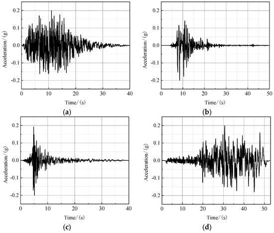 The acceleration–time–history curve of the input wave. (a) Beijing artificial wave. (b) Kobe wave. (c) Loma Prieta wave. (d) Landers wave.