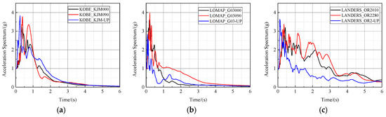 Acceleration response spectrum of input seismic waves. (a) Kobe wave. (b) Loma Prieta wave. (c) Landers wave.
