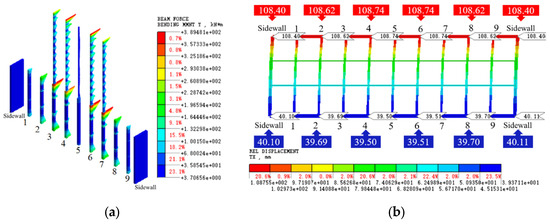 For the convenience of analysis, the middle columns in the subway station are numbered column 1 to column 9, whereas the columns in the subway stations with upper cover structures are numbered column 3 to column 7, as shown in Figure 10. The calculated results of the bending moment and deformation of the middle column of the subway station complex and its superstructure system under the action of the Beijing artificial wave with a peak acceleration of 0.2 g are shown in Figure 10. As can be seen from the bending moment cloud atlas in Figure 10, the top of the negative first floor and the bottom of the negative third floor of each middle column of the subway station have significantly larger bending moments compared to the rest of the column. At the same time, the internal force and deformation of the middle column in the area with and without the upper cover structure are also different. Comparing the top bending moment of the middle column of the negative layer of the subway station at different locations, it is found that the bending moment of the building with upper cover is obviously larger than that of the building without upper cover, and the deformation of the underground structure with upper cover is still shearing type deformation, which is consistent with the conclusion obtained in Reference [6]. In addition, the horizontal deformation of the middle column of the underground structure is slightly larger than that of the side wall, and that of the middle column at the position directly connected with the upper building is the largest.