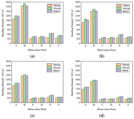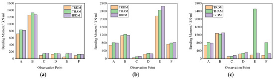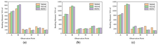 Bending moment calculation results of different upper cover structures. (a) Frame structure. (b) Frame-symmetric shear wall structure. (c) Frame-asymmetric shear wall structure.