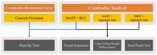 In this study, the feasibility of the MAST-RCC composite pavement system for rural roads in Cambodia was evaluated. Initially, laboratory tests were conducted to achieve the best mix design for RCC and MAST. To observe the RCC and MAST’s in situ performance, a 200-m testbed was constructed on a typical rural road in Phnom Penh, Cambodia. The testbed was divided into three different sections: MAST surface layer with an RCC base course, MAST surface layer with a general aggregate base course, and normal DBST with a general aggregate base course. Three months after opening the testbed to traffic, tests were conducted to assess each section’s performance. Firstly, a visual inspection was performed to observe the surfaced distresses present in each section. Secondly, a light-falling weight deflectometer (LFWD) was used to evaluate each section’s structural condition. Thirdly, a sand patch test was conducted to assess the surface roughness of the pavement. Lastly, since rural roads are also located near residential areas in Cambodia, the noise level produced by the tire–pavement interaction on MAST was compared to the typical concrete pavement present in most of the residential areas in Cambodia using the pass-by test. The general flow of this research is presented in Figure 1.