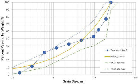 In this study, the aggregates used are a combination of coarse and fine aggregates to achieve a uniform particle size distribution with close proximity to the Fuller curve. The aggregate gradation is shown in Figure 3, which is in accordance with the RCC gradation limit of ACI PRC-327-14 [28]. The target water-to-cement ratio of the mix design is 48%, as calculated from the mix design by unit weight summarized in Table 2.