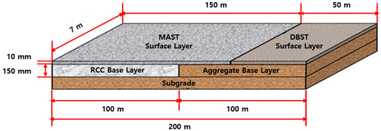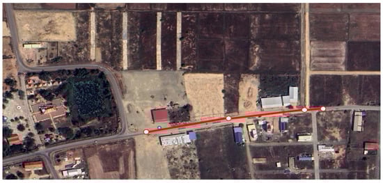 The testbed was constructed on the rural road just before the boundary of Phnom Penh. Figure 5 shows an aerial view of the testbed location, as well as the span of the road where the testbed was constructed. The testbed’s total length was 200 m and was divided into three sections as shown in Figure 6. The first section with a length of 100 m was the proposed composite pavement, which consisted of a MAST surface layer and an RCC base layer. The second section was a MAST surface layer with an aggregate base layer and had a length of 50 m. Lastly, the third section was a 50-m long typical DBST surface layer and aggregate base layer. The third section served as the point of reference in this study. The thicknesses of the surface and base layers of all the sections were 10 mm and 150 mm, respectively, which were in accordance with the typical road structure in Cambodia [25].