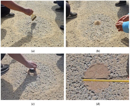 In this study, the sand patch test was conducted according to ASTM E965-15 standards [35], and the test procedure is presented in Figure 8. Basically, the sand patch test determines the pavement surface’s roughness by volumetric approach. A known volume of sand was placed on the clean and dry pavement surface. The sand was gradually spread on the pavement surface in a circular manner using a smooth and flat disk until the entire amount of sand was spread evenly on the pavement surface. Assuming that the sand uniformly fills the full depth of the crevices on the pavement surface, at least four diameters of the formed circle were measured on different angles, and the average diameter was used to calculate the mean text depth (MTD) as follows: