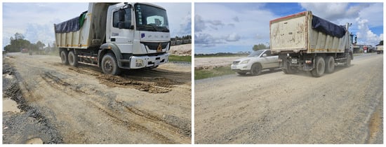 It can be observed that a significant amount of depression is present in Section 3 while Sections 1 and 2 still maintain an evenly leveled surface. These depressions were mainly caused by the heavy truck traffic, shown in Figure 11 that passes on the testbed. The location of the testbed is on the outskirts of Phnom Penh, which is commonly the route of the heavy truck that carries goods from rural areas to the city and vice versa. The structural capacity of Section 3 was not sufficient to support the high frequency of the heavy loading of the truck. Moreover, the tropical climate of Cambodia weakened the aggregate base layer of the pavement. Frequent rainfall and poor drainage promote a long duration of water retention in the aggregate base, thus decreasing its structural capacity.