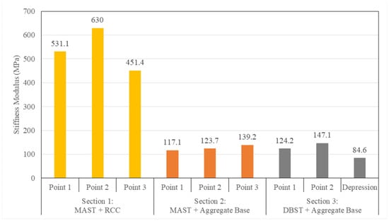 Three testing points were chosen for each section, and these points are evenly spaced to represent the whole span of the section. In Section 3, one point was intentionally located on the depression to investigate the structural condition of the deteriorated location. At each point, three repetitions of LFWD testing were conducted. The stiffness modulus per repetition was calculated using the Boussinesq half-space equation, and the average value of the three stiffness moduli was considered as the representative stiffness modulus of the testing point. Figure 13 shows the values of the representative stiffness modulus of the testing points in all the sections.