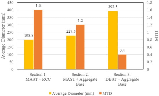 To assess the surface roughness of each section of the testbed, the sand patch test was performed. One testing point per section was chosen, and a uniform volume of sand amounting to 5000 mm3 was used for the test. Four diameter readings were obtained, and the average diameter was calculated to compute the MTD. The results of the sand patch test are summarized in Figure 14.