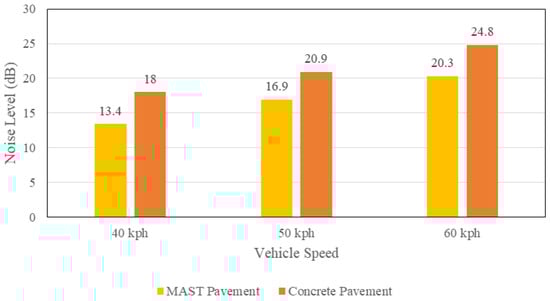 Based on the results, the noise level of the MAST pavement is lower than that of the concrete pavement by at least 4 dB in all of the testing vehicle speeds. Therefore, the MAST pavement is an appropriate replacement for concrete pavement in residential areas of Cambodia in terms of noise level.