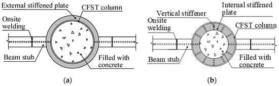 10]. Typically, reinforced plates are welded at the connection region to facilitate the ease of connecting steel beams and a smooth load transformation. Based on the location of the reinforced plates, there are three reinforcing forms in the CFST column to steel beam connection: external stiffened, internal stiffened, or both, as shown in