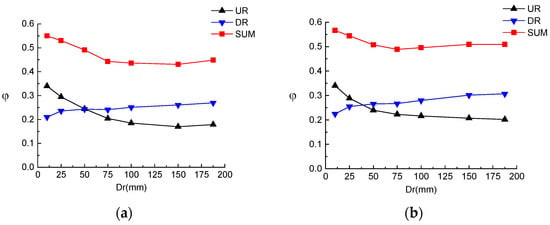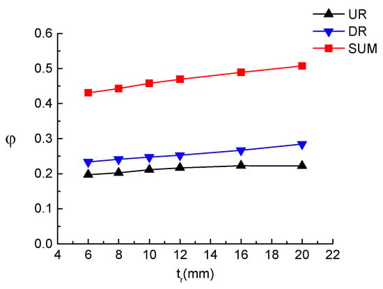 Figure 10, where the horizontal axis represents the width of the inner ring plate, and the vertical axis φ represents the load bearing ratios. Specifically, UR represents the load bearing ratio of the inner ring plate at the top flange, DR represents the load bearing ratio of the inner ring plate at the bottom flange, and SUM represents the sum of the two. As can be seen from the Figure, when the width of the inner ring plate was not greater than 10 mm, the load bearing ratio through the top and bottom inner ring plates increased rapidly with the increase in the ring plate width. The load bearing ratio of the top ring plate was higher than that of the bottom ring plate. When the width of the inner ring plate exceeded 25 mm, the load bearing ratio of the top ring plate decreased as the width of the plate increased. However, the load bearing ratio of the bottom ring plate still gradually increased as the width of the plate increased. When the plate width reached to 150 mm, the load bearing ratio stabilized at a constant level, indicating the maximum bearing capacity of the ring plates.