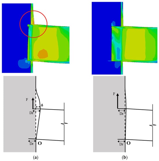 When the width of the ring plate was relatively small (e.g., tr = 16 mm, Dr = 10~25 mm), there would be detachment between the steel tube wall and the core concrete. In this case, the weak stiffness failed to meet the design requirements for bending moments. When the width of the ring plate was excessively large, such as 75 mm to 187.5 mm, the load bearing capacity of the ring plates would not increase significantly. Based on the above analysis, the optimal width of the inner annular plate would be 75 mm. This was the chosen width for the subsequent analysis.