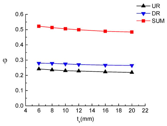 Table 1 were used to analyze the influence of the vertical stiffener on the load distribution. The thickness parameter of the vertical stiffeners was set as tv = 6 mm, 8 mm, 10 mm, 12 mm, 16 mm, and 20 mm. As shown in