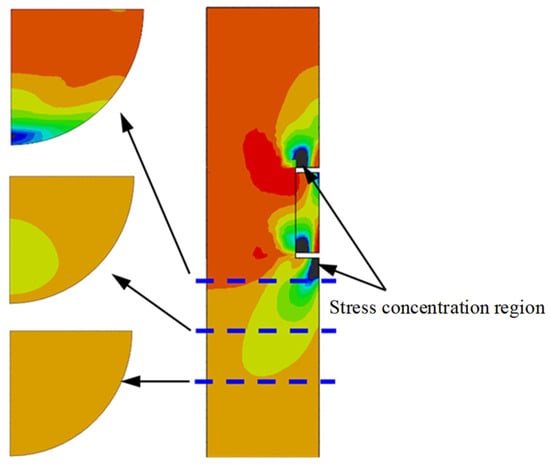 Figure 15 shows the Mises stress contour of the concrete. The concrete surrounding the ring plate was in a state of localized compression. An uneven stress distribution was observed: higher stress level in the region near the steel tube wall compared to the core region. In particular, on the cross section near the connection, the stress was unevenly distributed along the section. As the load was transmitted to a certain distance, the stress distribution on the section tended to become uniform. This distance was defined as the stress transition length. When the transition length is greater than the story height, the concrete near the tube wall may experience crushing due to the combined effect of the load from the upper floor and the current floor. This can lead to the buckling and failure of the pipe wall, resulting in serious consequences.