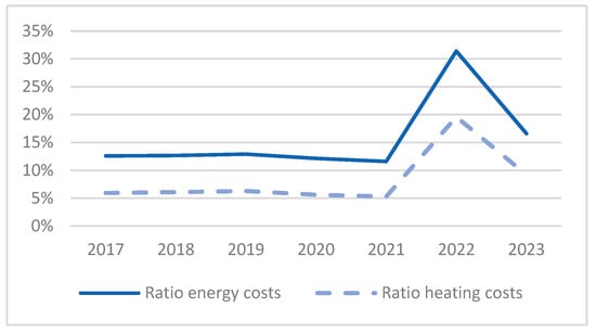 To gain insight into the evolution of energy poverty in social housing in Flanders over the past five years, an overview of the ratio of the costs for energy compared to the income of the tenants is presented by the full line in Figure 1. Additionally, in Figure 1, the ratio of the costs for heating compared to the income is presented by the dashed line. As shown in Figure 1, the total cost for energy exceeds the 10% threshold for all years, meaning that families suffered from energy poverty according to the definition of Meyers and Coene [4]. A remarkable increase is shown for 2022, due to the significant increase in energy costs as a result of the geopolitical situation. During the first months of 2023, the energy prices decreased again; however, they are still at a higher level compared to the situation before 2022. If only the cost for heating is studied, the ratio was well below 10% until 2021. Due to the increase in energy prices over the past two years, the cost of heating approaches 10% of the income threshold. As a result, according to the definition of Boardman [14], the households have suffered from energy poverty since 2022.
