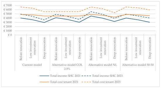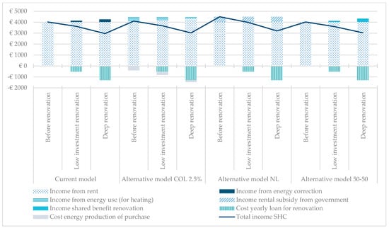 The results for the SHCs show that the yearly income from rent is sufficient to repay the cost of the loan for renovation for all renovation options. In the current economic model, the energy correction is not sufficient to compensate the loan for the renovation, resulting in a lower total income for the SHCs. For the first alternative economic model (COL 2.5%), the income from rent before renovation increases by 2%, compared to the current economic model and by 5% and 8%, respectively, after the low-investment and deep renovations. This is due to the reduced energy cost after renovation, allowing for an increase in the rent without exceeding the 2.5% ratio for the monthly cost of living compared to the yearly income. Although the increased income from rent is insufficient to compensate for the investment cost of renovation, the increased income from rent after renovation could be an incentive for the SHCs to invest in renovation. For the second alternative economic model (NL), an increase in income from rent of 12% is found compared to the current economic model. Since the increase in rent is not related to the renovation, this economic model does not result in an incentive to invest in renovation. The increase in rent is, however, not enough to compensate for the cost of the loan for both the low-investment and the deep renovation options. In the third alternative economic model (50–50), no increase in rent is included. The shared benefit from the energy renovation is not sufficient to compensate for the renovation cost. Again, this model does not result in an incentive to invest in renovation. Regarding the total income for the SHCs, the dark blue line in Figure 2, a decrease in income after renovation is found in every economic model. Comparing the different economic models, a similar decrease in total income for the SHCs of, respectively, 10% and 26%, after the low-investment and deep renovation is found in the current economic model and alternative economic models COL 2.5% and 50–50. In the alternative economic model NL, a decrease in the total income for the SHCs of, respectively, 12% and 29%, is found after the low-investment and deep renovations. When comparing the total income of the SHCs over the different alternative economic models, some differences are found, as presented in Table 2. The smallest increase in total income for the SHCs compared to the current economic model is found for alternative model 50–50, 0% to +2.6%, and for alternative model COL 2.5%: +1.9% to +2.4%. The highest increase in total income for the SHCs compared to the current economic model, +8.1% to +11.9%, is found for alternative model NL. However, in alternative model NL, the total income of the SCHs compared to the current economic model is smaller after renovation. Although smaller profits are expected from alternative models COL 2.5% and 50–50, they give an incentive for renovation compared to the current economic model.