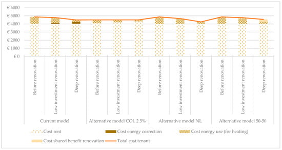 Considering the tenants’ perspective, the total cost decreases after renovation in all economic models, except for the alternative economic model ‘COL 2.5%’, where the cost is limited to a percentage of the yearly income regardless of the renovation, as shown in Figure 3. Table 3 presents an overview of the total cost for the tenants in the alternative economic models compared to the current economic model. For the alternative economic model ‘COL 2.5%,’ the difference with the current economic model is the highest before renovation and is comparable after deep renovation. This is due to the limited cost of energy use after deep renovation, resulting in a total cost for the tenant in the current model close to 2.5% of the yearly income, whereas before renovation the cost for heating is much higher in the current economic model. In the second alternative economic model ‘NL,’ the increased rent is paid by the government. This results in identical costs for rent and energy use for the tenant compared to the current economic model. Since the energy correction is not included in this alternative economic model, the total costs are, however, lower compared to the current economic model. It should be noted that in this alternative economic model, the tenants still have to negotiate their individual contracts with energy suppliers. The ‘50–50’ economic model results in a comparable total cost for the tenants compared to the current economic model. This is because the energy correction for the low-investment renovation is similar to 50% of the energy benefits. However, for the deep renovation, the current energy correction fee is lower than 50% of the shared benefits after renovation, resulting in a small increase in total cost for the tenants compared to the current economic model. From a tenant’s perspective, limiting the monthly COL to 2.5% of the yearly income is the most beneficial.