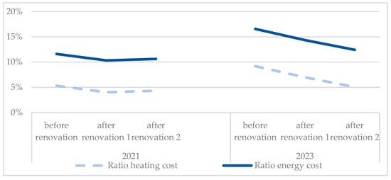 Ratio of the yearly costs for energy and yearly costs for heating compared to the yearly income of tenants before and after renovation for 2021 and 2023.