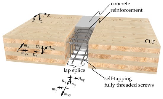 In [16], a method is proposed where screws are arranged horizontally and coupled by a screw connector. Another approach for the edge connection, beyond those primarily based on adhesives, is presented in [4,17]. This concept involves a dovetail joint filled with a synthetic reaction resin. Another approach using a dovetail joint is presented by [18]. However, this edge connection is intended for use in TCC slabs [19]. In [20], an edge connection for two-way spanning TCC slabs with CLT is shown. Here, reinforcing bars are glued into the narrow faces of the CLT and poured with concrete. This approach of glued-in rebars was then applied by [15] to create an edge connection between two CLT elements. Forces are transferred via a lap splice of this reinforcement between two adjacent CLT elements. Our prior work in [14] confirmed the capability of this connection type for point-supported flat slabs and, therefore, laid the foundation for the edge connection presented in this paper.