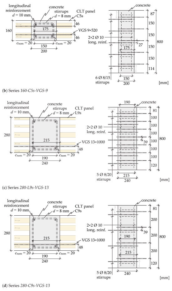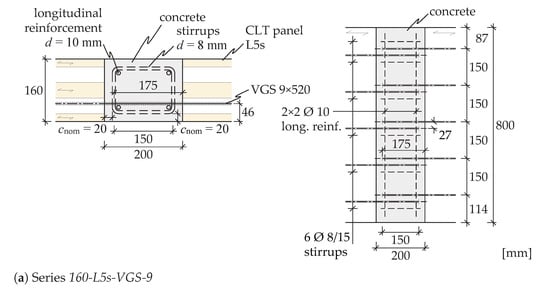 A total of 12 test specimens were tested in 4 series with 3 tests each. The test specimens for each series are illustrated in Figure 3. In these series, several parameters were varied, including the number and diameter of the screws, the height and layup of the CLT elements, as well as the width of the concrete. This selection was made to verify practical distances between the screws and validate the analytical approach on a wide range of parameters. The length of the lap splice was selected as a function of the screw diameter to prevent failure of the concrete following the regulations given in [26]. The fasteners, except for the 160-C5s-VGS-9 series, are only arranged in the tension area of the cross-section resulting from the test setup (see Figure 4). The screws are inserted at a spacing e of 100 mm to 200 mm, depending on the series. The distance between the screws in the lap splice is set to three times the nominal diameter d for all specimens. The concrete is reinforced with 8 mm diameter stirrups. A longitudinal reinforcement with a diameter of 10 mm is arranged in the corners of these stirrups. The concrete cover is taken as the minimum value according to Eurocode 2 [26], resulting from exposure class 1 (XC1). XC1 is assumed to be the equivalent of service class 1 according to Eurocode 5 [30]. The distance of the screws to the edge () results from the concrete cover and the nominal diameters of the reinforcements, including assembly clearance.