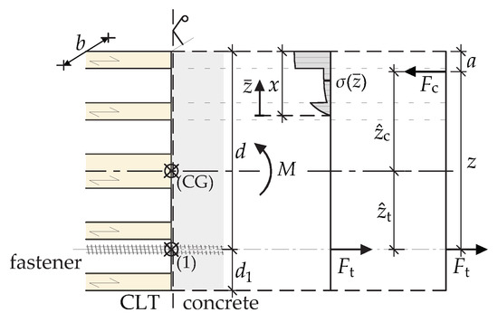 The height of the compression zone x is, therefore, obtained by solving the quadratic Equation (9). Using the compression zone height, the resultant compressive force may be determined according to Equation (4). The load on the fastener can be directly determined using Equation (7). For an engineering approach, it is reasonable to assume a constant compressive stress that is equal to the compressive strength . However, for CLT, this results from the orientation of the layers.