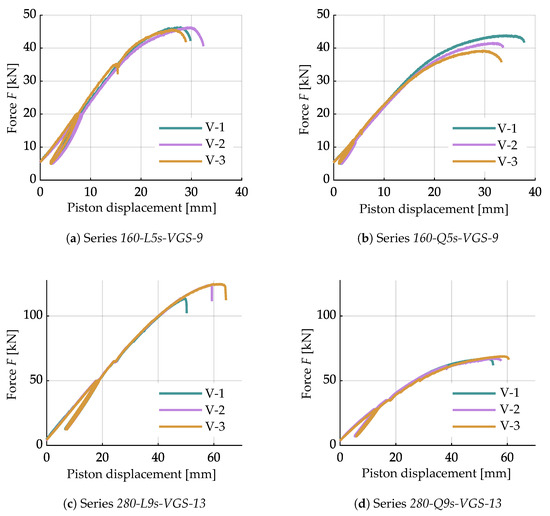 In Figure 10, the load-deformation curves of the tests are shown. The curves follow a linear trend up to a load level of approximately 60 to 70% of the maximum load (). It is noticeable that there is a clear increase in stiffness within the unloading and reloading paths. A clear decrease in load is observed only once the maximum load is reached, and this is characterised by an increase in deformations. The load plateaus in some test curves in the range of approximately are due to the test procedure. Here, the displacement transducers were removed from the test specimen to prevent damage while maintaining a constant load. As previously shown in Table 3, the load-deformation curves also show a small scatter within each test series regarding the stiffnesses as well as the maximum loads achieved. In all tests, failure occurred due to a tensile failure of the screws. Further information is presented in the following Section 3.1.2.