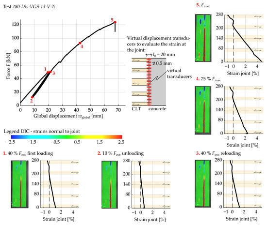 The optical measurements conducted during the experiments offer valuable further information. In this way, the strains in the area of the joint between the concrete and the CLT panels can be observed in more detail within post-processing. In Figure 11, an example of the evaluation based on test 280-L9s-VGS-13-V-2 is given. By plotting the strains perpendicular to the joint across the measured area, the regions that are subjected to compression or elongation can be identified. In addition, the strain across the joint itself is shown in the diagrams. For this, virtual displacement transducers are placed across the joint at a distance of 0.5 mm ( mm, see Figure 11). Subsequently, the strains are analysed over the entire height of the cross-section.