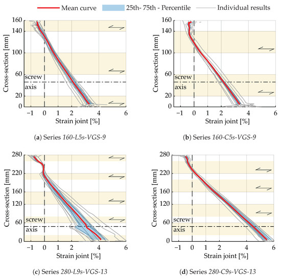 In Figure 12, the evaluation of the strains is summarised for all recorded joints (four each test) and all series at the maximum load . These diagrams align with the principles of the analytical approach described in Section 2.2. It is shown that there is always compressive strain in the top lamellas. Even when this layer is oriented parallel to the joint and the strain profile is no longer linear over the cross-section, distinct strains are observed when the maximum load is reached. This is in contrast to series 280-L9s-VGS-13, where only small strains occur in the transverse layer between two relatively stiffer longitudinal layer.