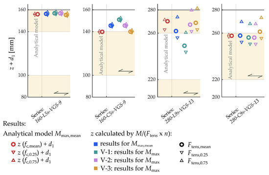 Another method for comparing the experimental results with the analytical model is shown in Figure 17. Here, a required inner lever arm is calculated for each test based on the maximum moment and the tensile strength of the screws , represented as , where n is the number of screws in the lower row of fasteners, assuming equal loading on all screws. The diagram considers the tensile test values at the 25th and 75th percentiles. This required inner lever arm is then compared with the result for the inner lever arm z according to the analytical model given in Section 2.2 for the maximum mean value of the series .