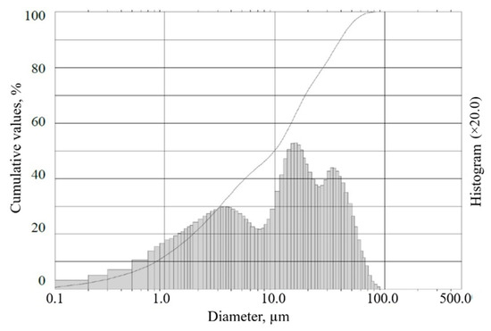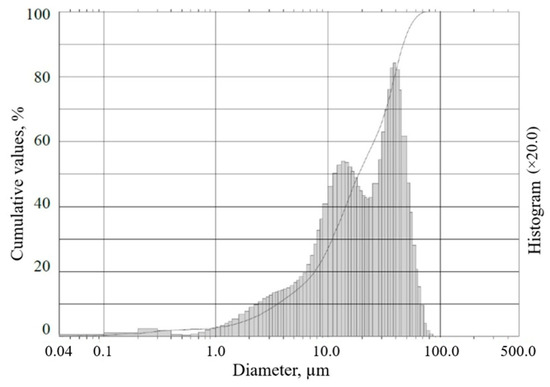 The tests were performed using CEM I 42.5 R, which satisfies all standards specified in EN 197-1 [37]. Figure 1 illustrates the particle size distribution of Portland cement. The measurements were conducted in the range of 0.10–500 μm. The average size of the particles was 15.05 μm.