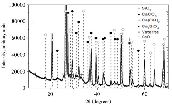 Figure 3 presents the BFA X-ray structural analysis results. The X-ray image shows that quartz (SiO2), which is present in 75% of the sample, is the predominant mineral. SiO2 usually forms during the burning of biomass at high temperatures [46]. Calcium oxide (CaO) is the second mineral prevailing in fly ash by content (12.8%). Other minerals identified in the X-ray analysis were calcite and portlandite, present at 7.0% and 2.8%, respectively. Similarly, the same minerals, but in different amounts, were found in BFA by other researchers [47,48].