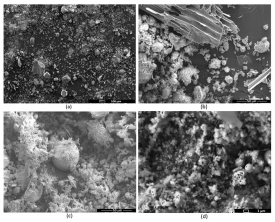 The results of the BFA analyses performed using SEM are presented in Figure 4. Figure 4 shows a great variety of BFA particle forms and sizes; there are also visible soot particles or pieces of unburned wood.