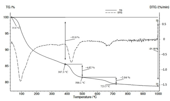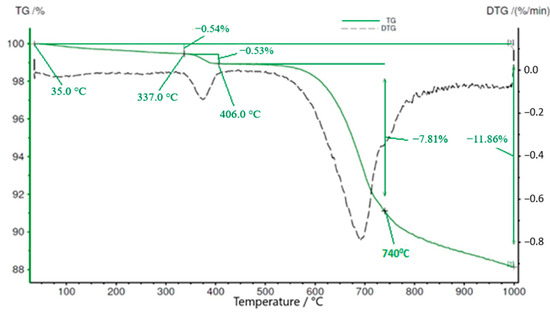 A thermogravimetric examination of BFA revealed (Figure 5) an endothermic reaction in the 335–412 °C temperature interval, where portlandite decomposition takes place. Another effect of an endothermic reaction, namely, the decomposition of vaterite, was observed in the temperature interval of 500–740 °C. The mass loss during this reaction was 7.81%; decomposition of calcite occurs at a temperature interval of 740–800 °C. The total mass loss was 12.34% [50].
