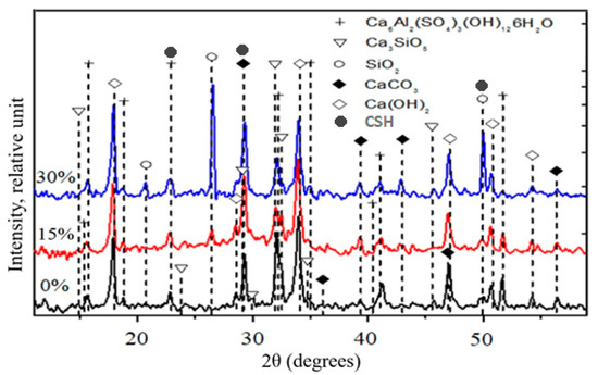 X-ray tests were conducted on hardened cement paste containing 0%, 15%, and 30% BFA by weight of cement after 28 days of curing. The test results are shown in Figure 6.