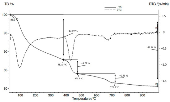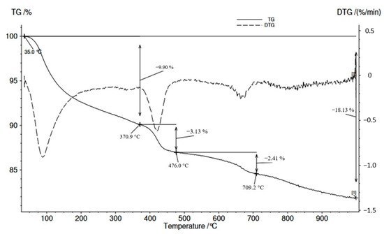 After 28 days of curing, TG/DTG analysis of the samples of compositions I, IV, and VII was performed (Figure 7, Figure 8 and Figure 9). The TG/DTG curves show three main effects of the endothermic reaction, during which the samples experienced significant weight loss. The mass loss in the temperature range 400–450 °C was caused by the release of water [57], as ettringite, calcium hydroaluminates, monocarboaluminates, and CSH lose hydrated water [58,59]. The first endothermic effects in the temperature range of 90–200 °C could be mainly attributed to the decomposition of ettringite (90–150 °C) and the decomposition of calcium silicate hydrates (which generally takes place in the temperature range of 160–200 °C). The decomposition of portlandite takes place between 400 and 500 °C, while the decomposition of carbonates occurs above 550 °C [60].