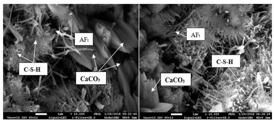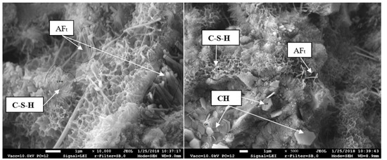Less-crystallized ettringite and large portlandite crystals, which are formed in water-filled pores, are shown in the cement matrix, where 30% of cement was substituted with BFA (Figure 12). The same CSHs were identified, but their accumulations are not as pronounced as those in the specimen where 15% of cement was replaced by BFA.