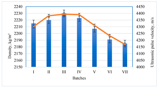 The results of the hardened cement paste density and ultrasonic pulse velocity tests are presented in Figure 13. The measured density of the control specimen was 2215 kg/m3. The highest densities of 2230 kg/m3 and 2223 kg/m3 were found in the concrete samples wherein 10% and 15% proportions of cement were substituted with BFA. Such an insignificant increase in density can be explained by the cement dilution effect when a denser structure is formed as a result of different particle sizes, better particle size distribution, and the development of new products [22].