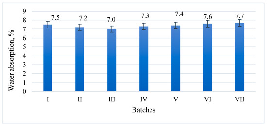 The results of water absorption tests conducted using completely dry specimens of sustainable concrete are presented in Figure 15. When up to 20% of cement was substituted with BFA, the water absorption of the samples tended to reduce. However, when more cement (up to 30%) was substituted with BFA, water absorption increased. These results correlate with the density results (Figure 13) and indicate that at a lower BFA content, the structure of concrete is denser due to better particle size distribution.
