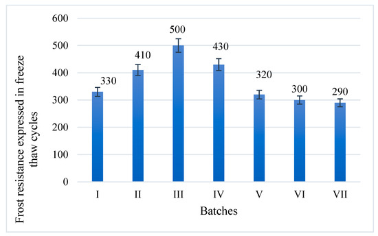 The durability of sustainable concrete predicted according to freeze–thaw cycles was measured based on porosity parameters. Frost resistance factor KF was calculated based on the assumption that concrete is frost-resistant when the volume of closed pores is higher than the increased volume of frozen water in capillary pores. Frost resistance factor KF was calculated using the following equation: